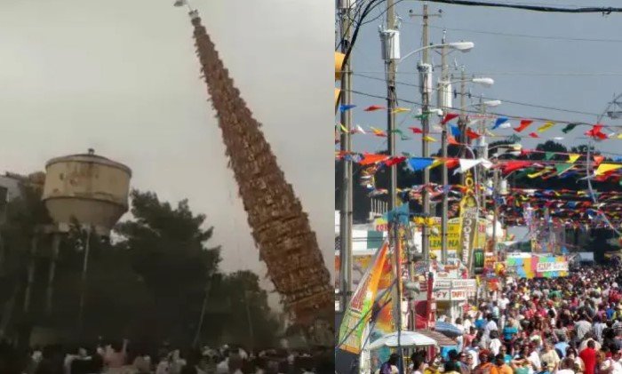 Bengaluru: A tragic incident marred the annual Madduramma Temple festival in Huskuru, Anekal taluk, as a towering 100-foot chariot collapsed during the Rathotsava (chariot procession), leaving one person dead and three others injured. The mishap occurred amidst heavy rain and strong winds, which caused the massive structure to lose balance and topple.