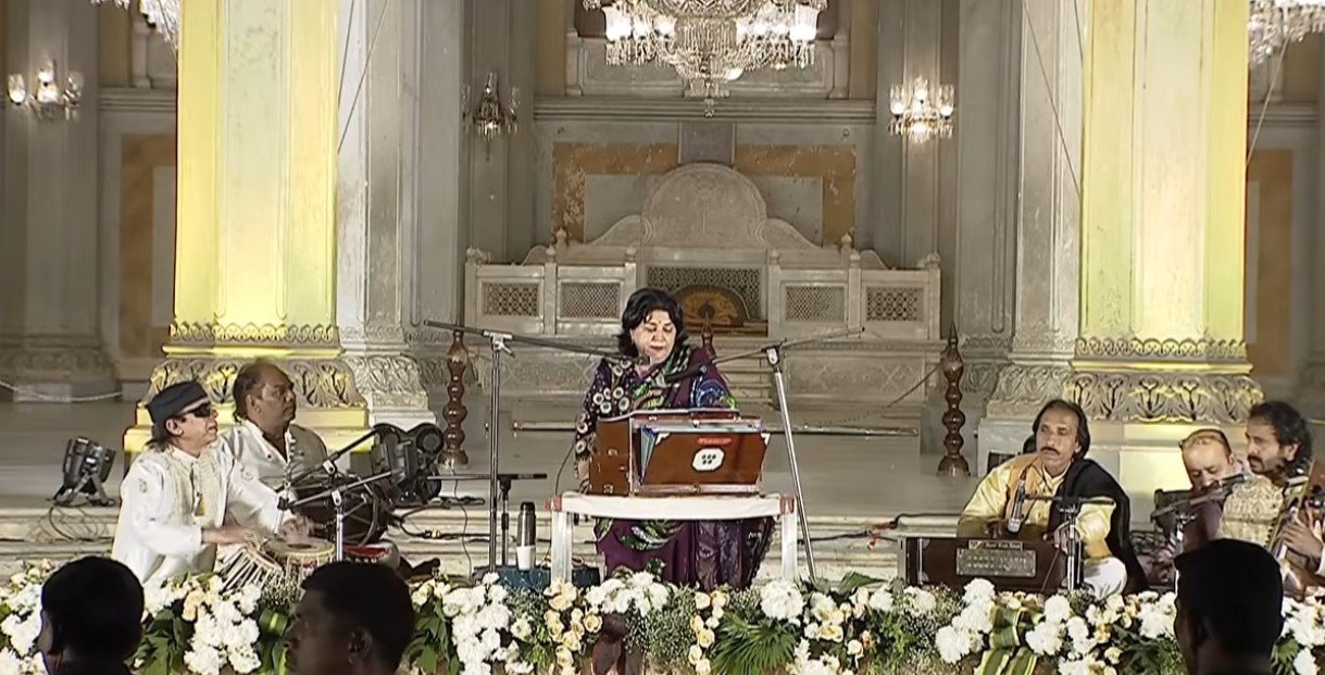 The acclaimed exponent from the Gwalior gharana, mesmerized the gathering with her profound renditions, blending devotion, poetry, and timeless rhythm. The palace’s majestic halls echoed with her powerful invocation of “Allah Hoo, Allah Hoo, Allah Hoo” – a repetitive chant that invoked divine presence, creating waves of meditative ecstasy among attendees.